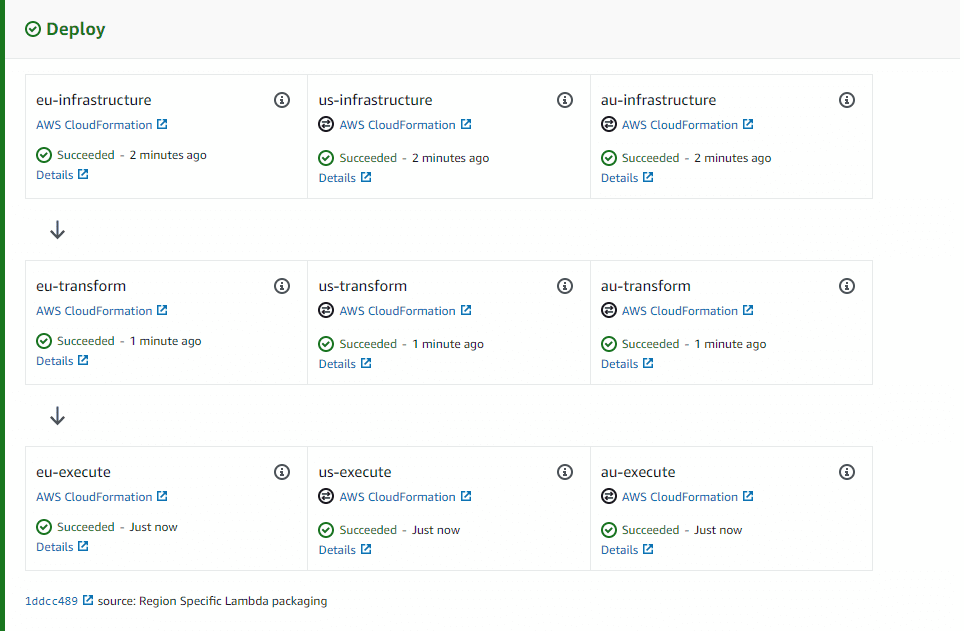 The last step is the one that actually performs the cross-region deploy using AWS CloudFormation. I did 9 actions in that step that is broken down as: